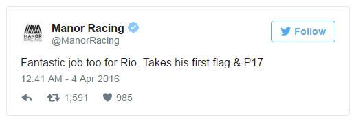 Sukses itu membuat Manor langsung melayangkan pujian kepada Rio lewat akun Twitter @ManorRacing. "Pekerjaan luar biasa untuk Rio. Mendapatkan finis pertamanya dan urutan 17," tulis akun @ManorRacing.