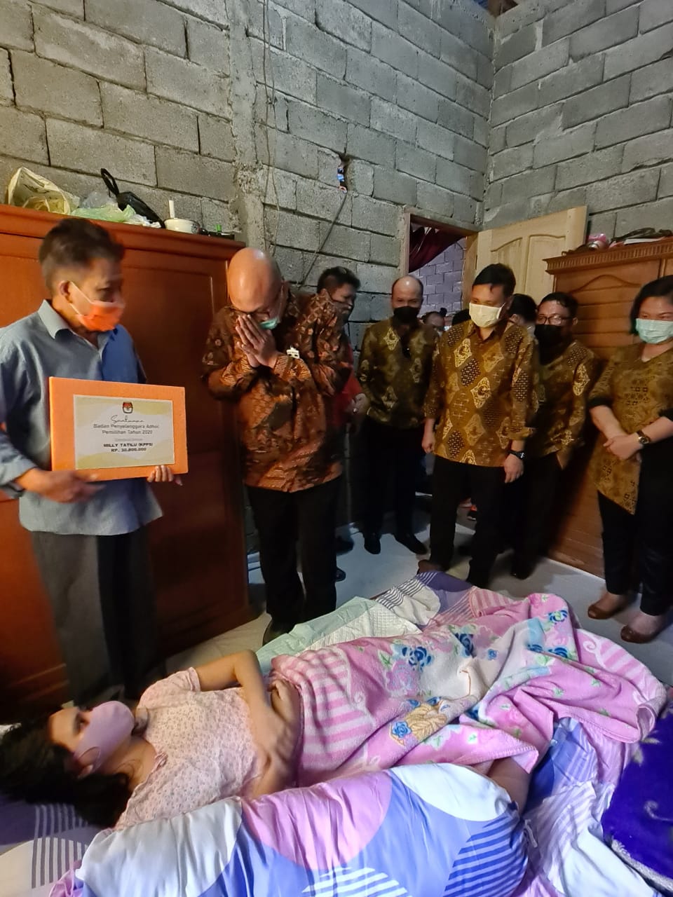 Usai serahkan SK CPNS, sorenya Ilham didampingi Komisioner KPU Sulut dan KPU Minahasa, di Kelurahan Paleloan Tondano Selatan menyerahkan santunan kepada Milly Tatilu, salah seorang KPPS yang menderita sakit stroke di saat melaksanakan tugas sebagai penyelenggara Pilgub Sulut 2020.