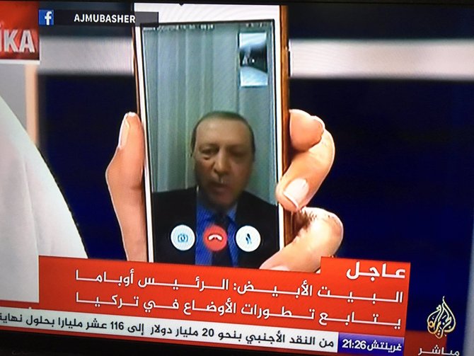 - Pukul 01.00, Presiden Reccep Tayyip Erdogan berhasil dihubungi oleh CNN Turki melalui sambungan aplikasi FaceTime. "Saya mengimbau rakyat Turki untuk berkumpul di alun-alun dan bandara melawan kudeta. Saya selalu percaya, kekuatan rakyat lebih besar dari apapun," ujarnya. Erdogan dilaporkan akan menuju ke Ankara sesegera mungkin.
