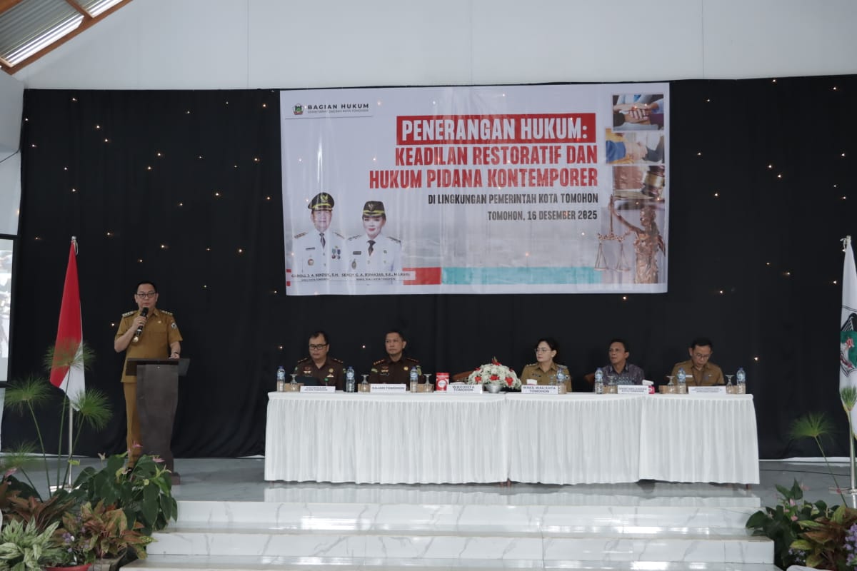 Wali Kota, Caroll J.A. Senduk, S.H., bersama Wakil Wali Kota, Sendy G.A. Rumajar, S.E., M.I.Kom., menghadiri kegiatan penerangan hukum keadilan restoratif dan hukum pidana kontemporer di lingkungan Pemerintah Kota Tomohon. Giat ini dilaksanakan di Aula Lumimpasot, Kota Tomohon, Selasa (16/12).